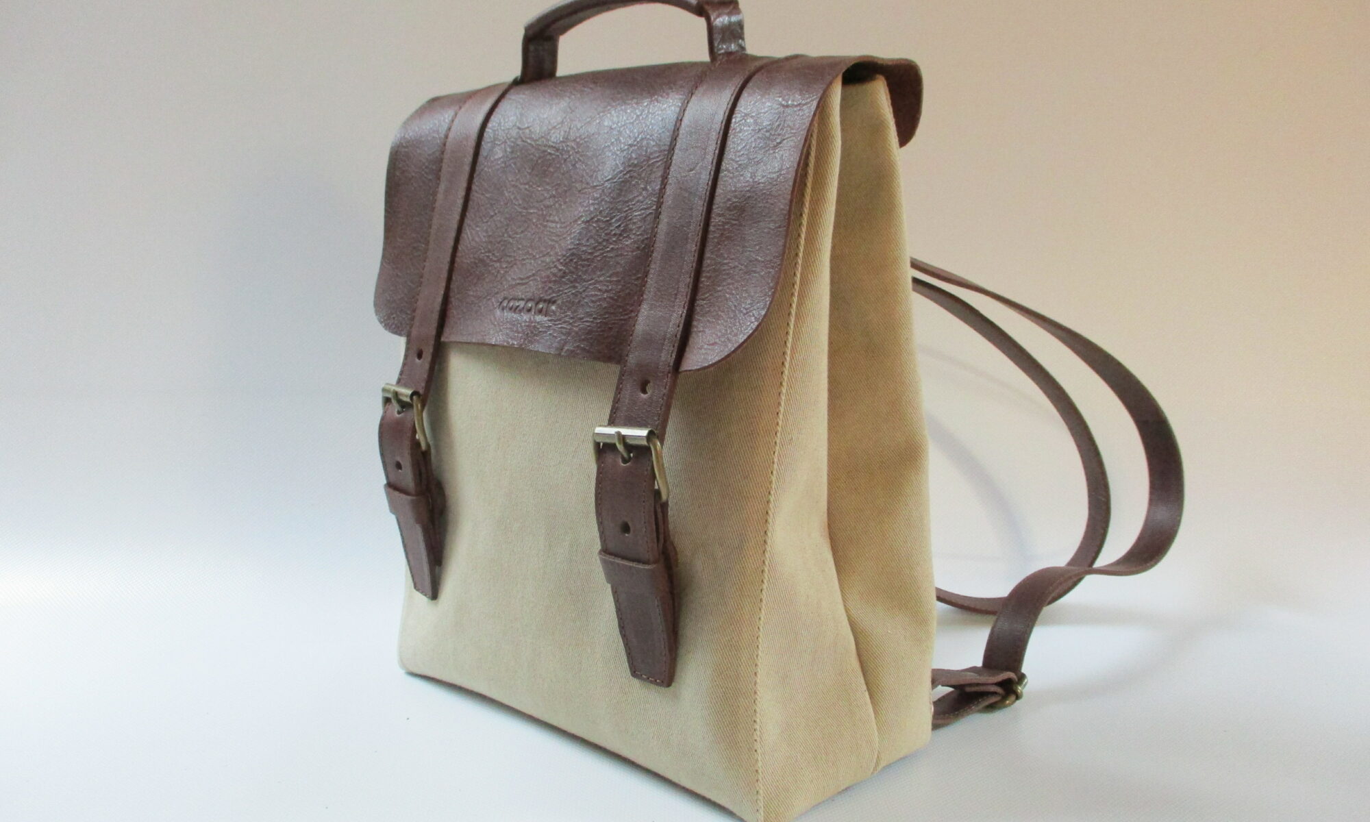 -rabat cuir couleur marron foncé, sac toile gros grain couleur beige